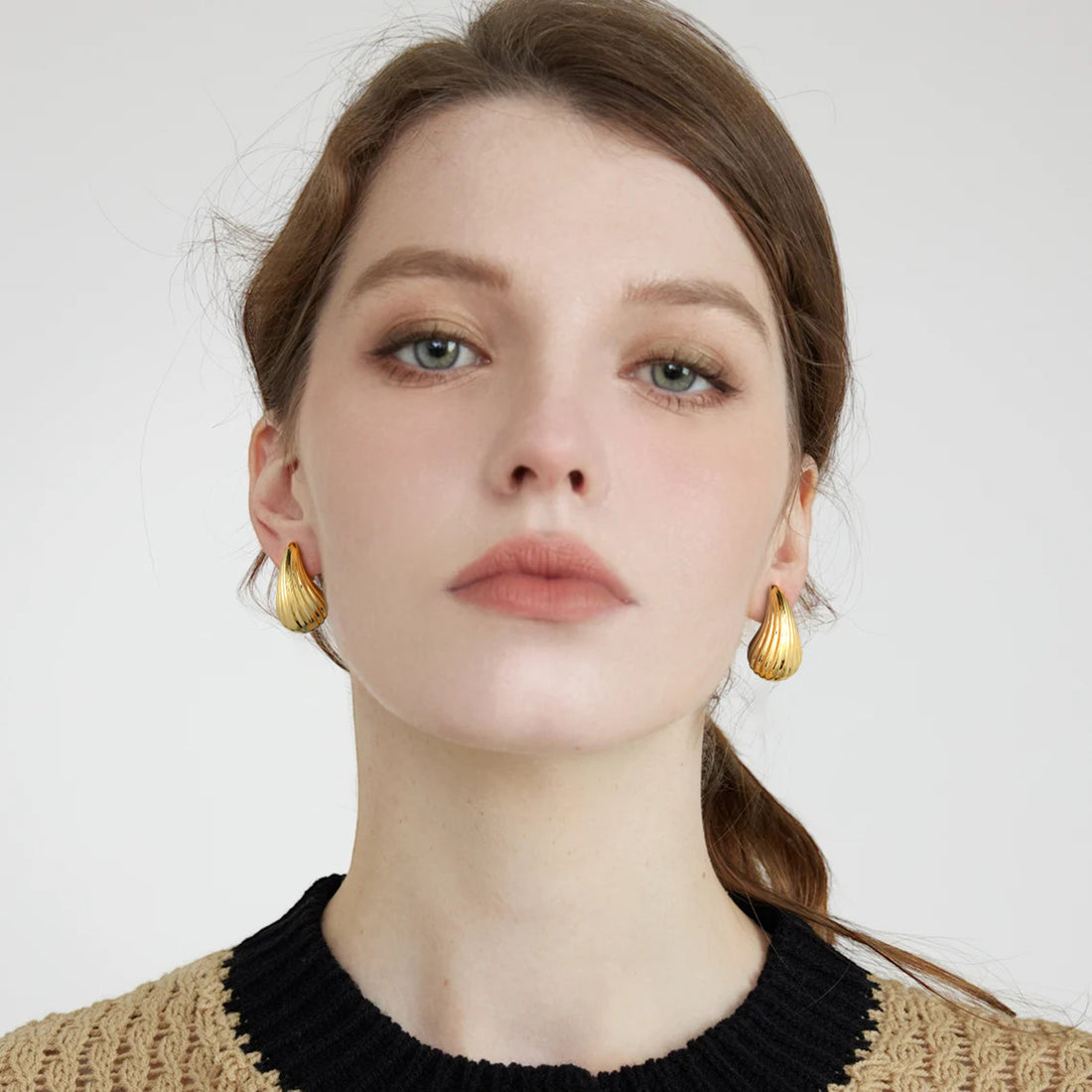 Golden O-shaped hoop earrings with a pattern of two intersecting strands