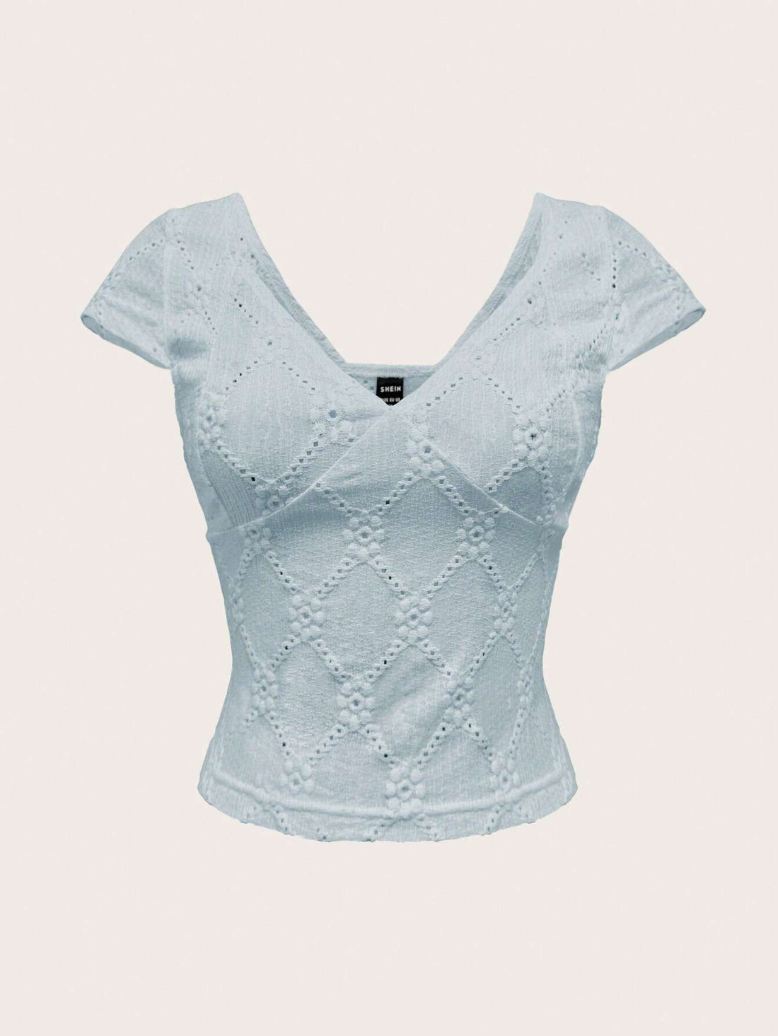 Light blue, women's top, hollowed out embroidery, V-neck short sleeved shirt