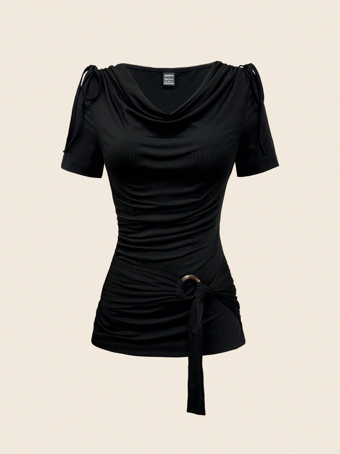 Black, women's tight fitting top, cinched waist, front chest pleated decoration