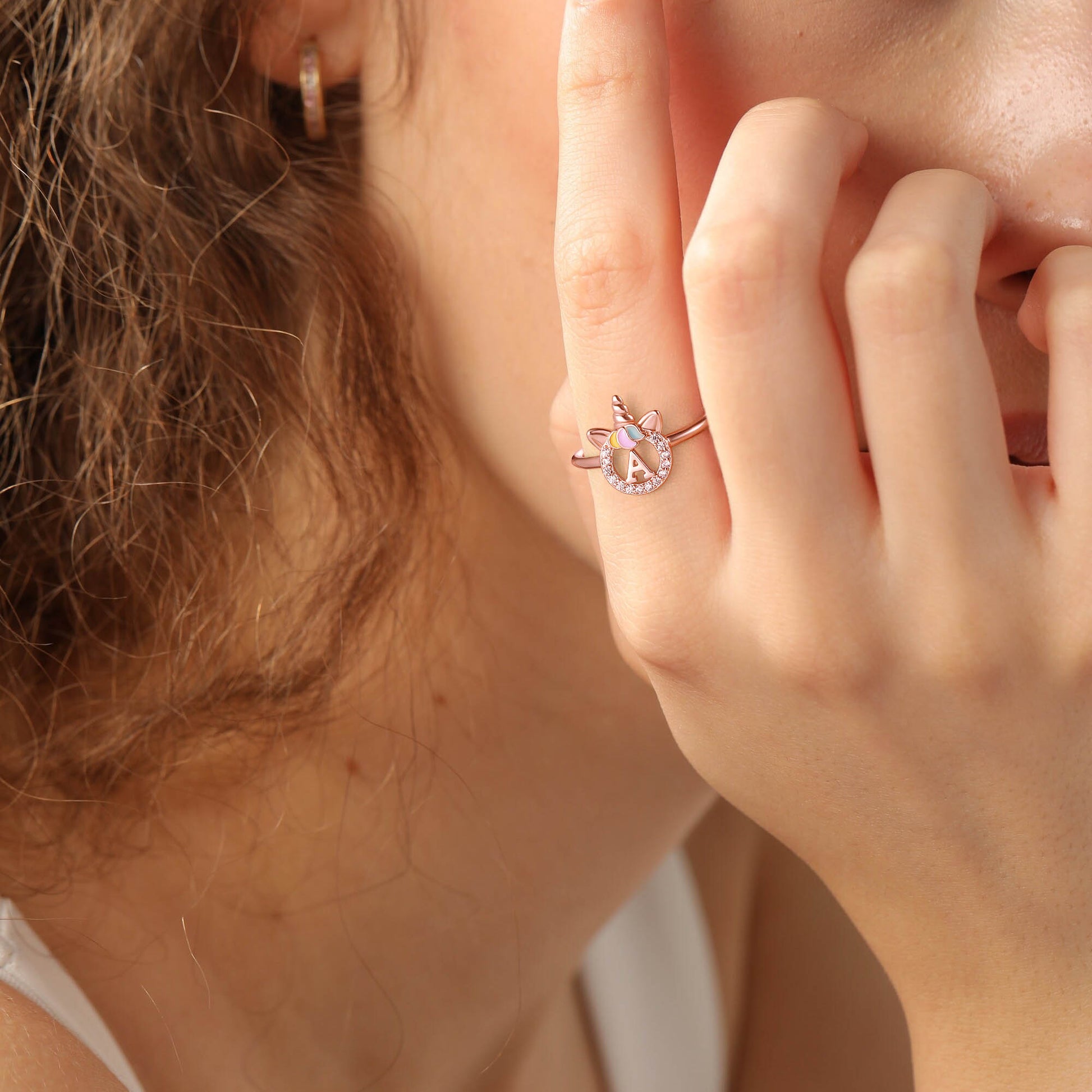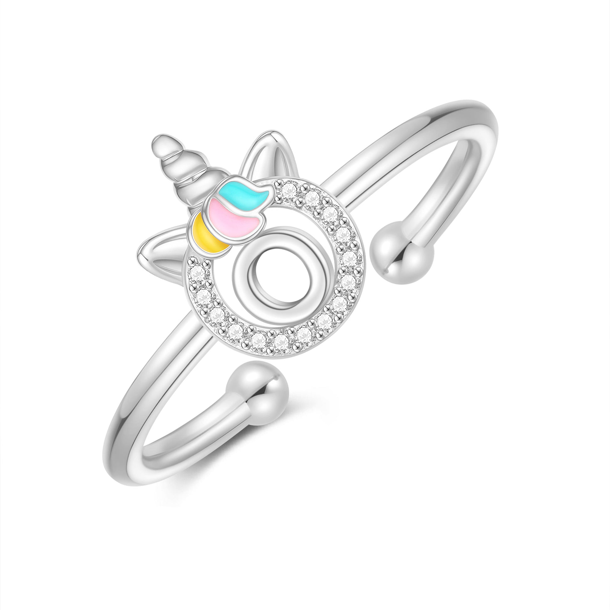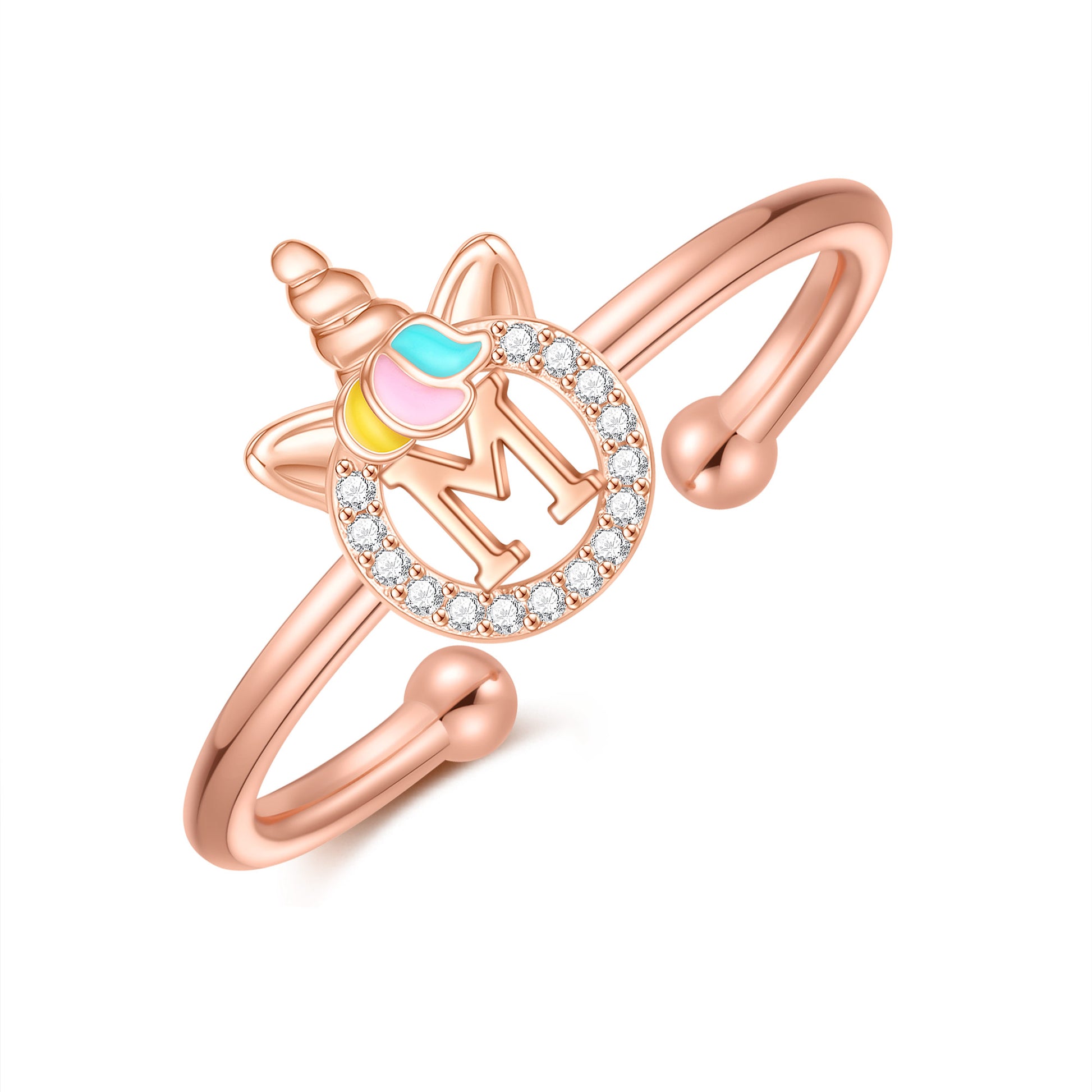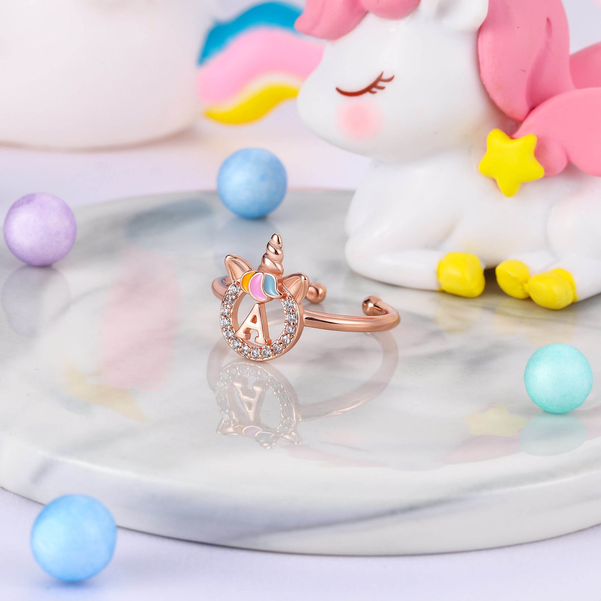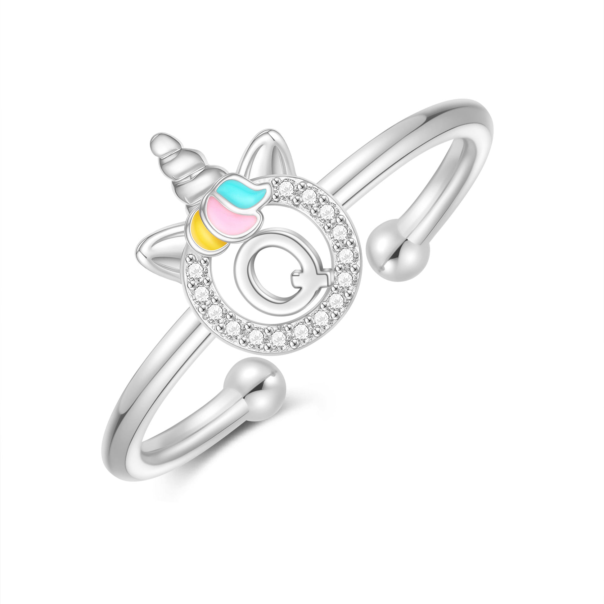 Unicorn Jewelry: Unicorns symbolize justice and bravery, as well as beauty, nobility, and purity. The unicorn girl's first letter ring prays for your happiness, good luck, health, and safety.