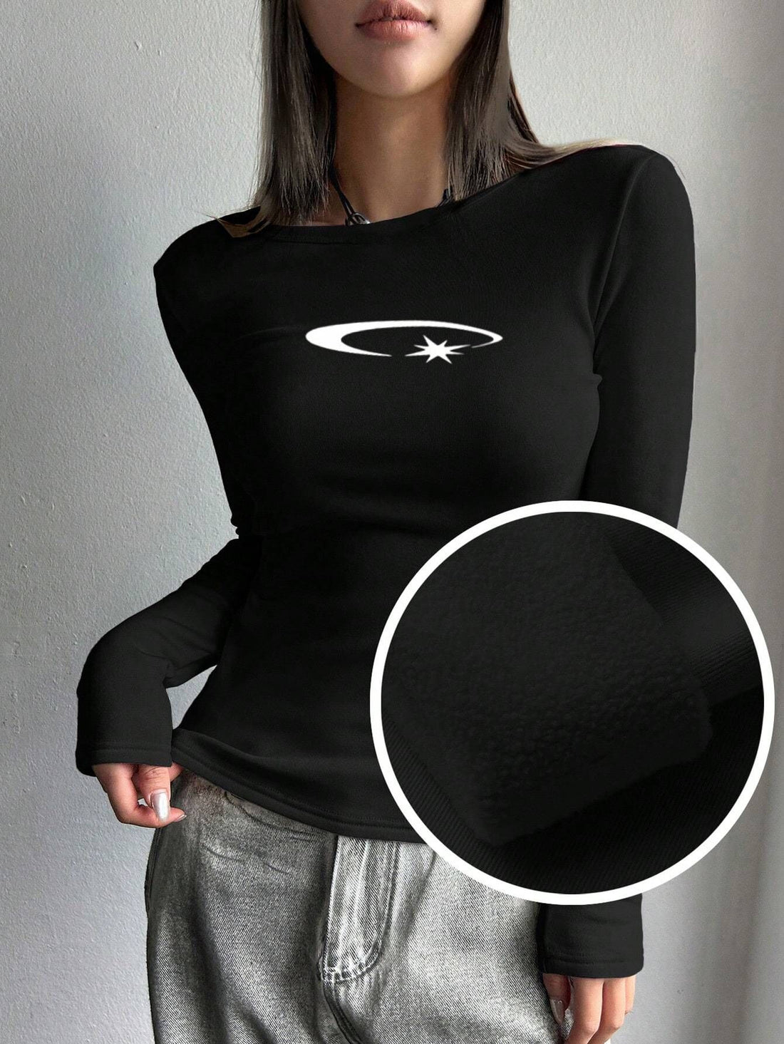 Black tight long sleeve with moon and star print, fashionable and comfortable slim fit