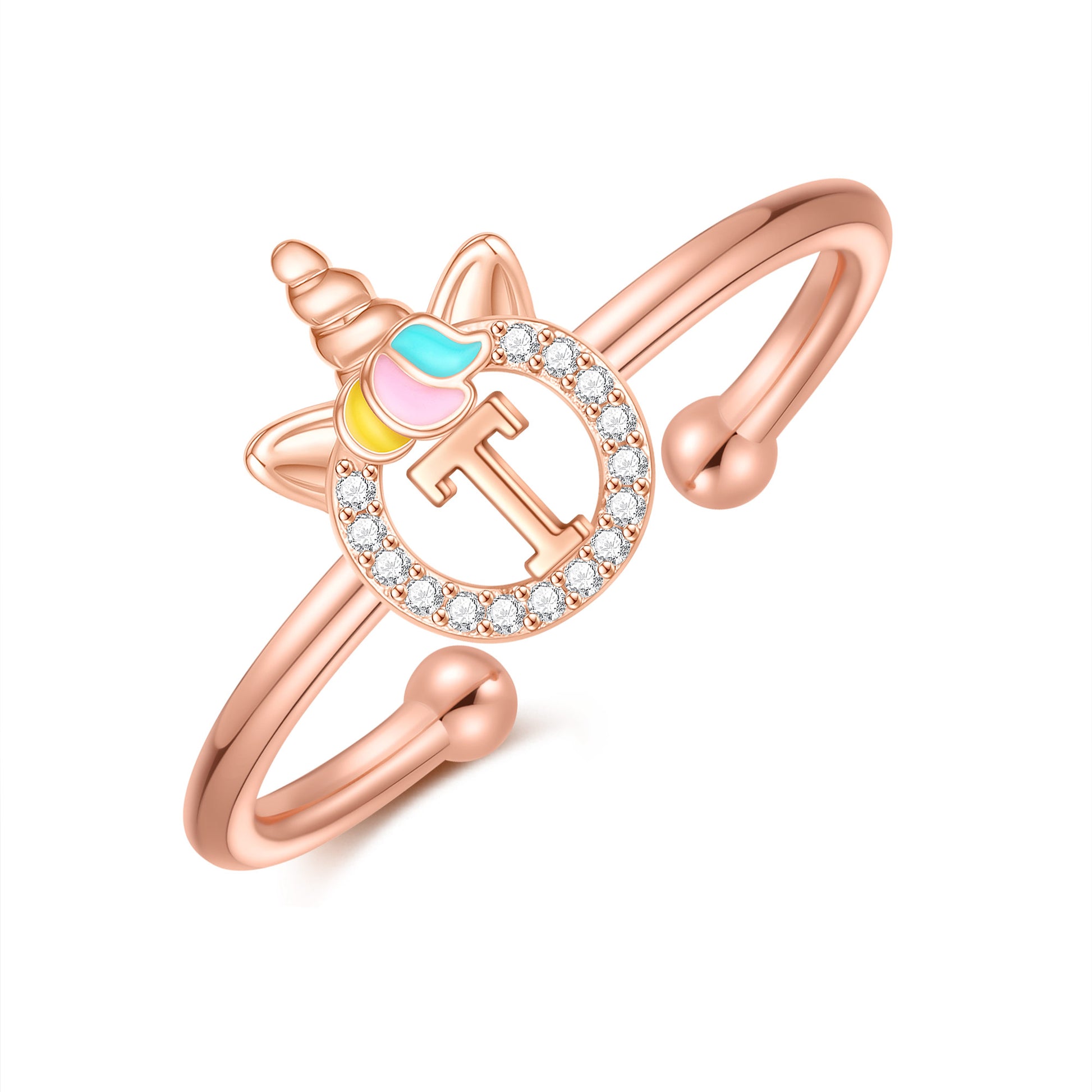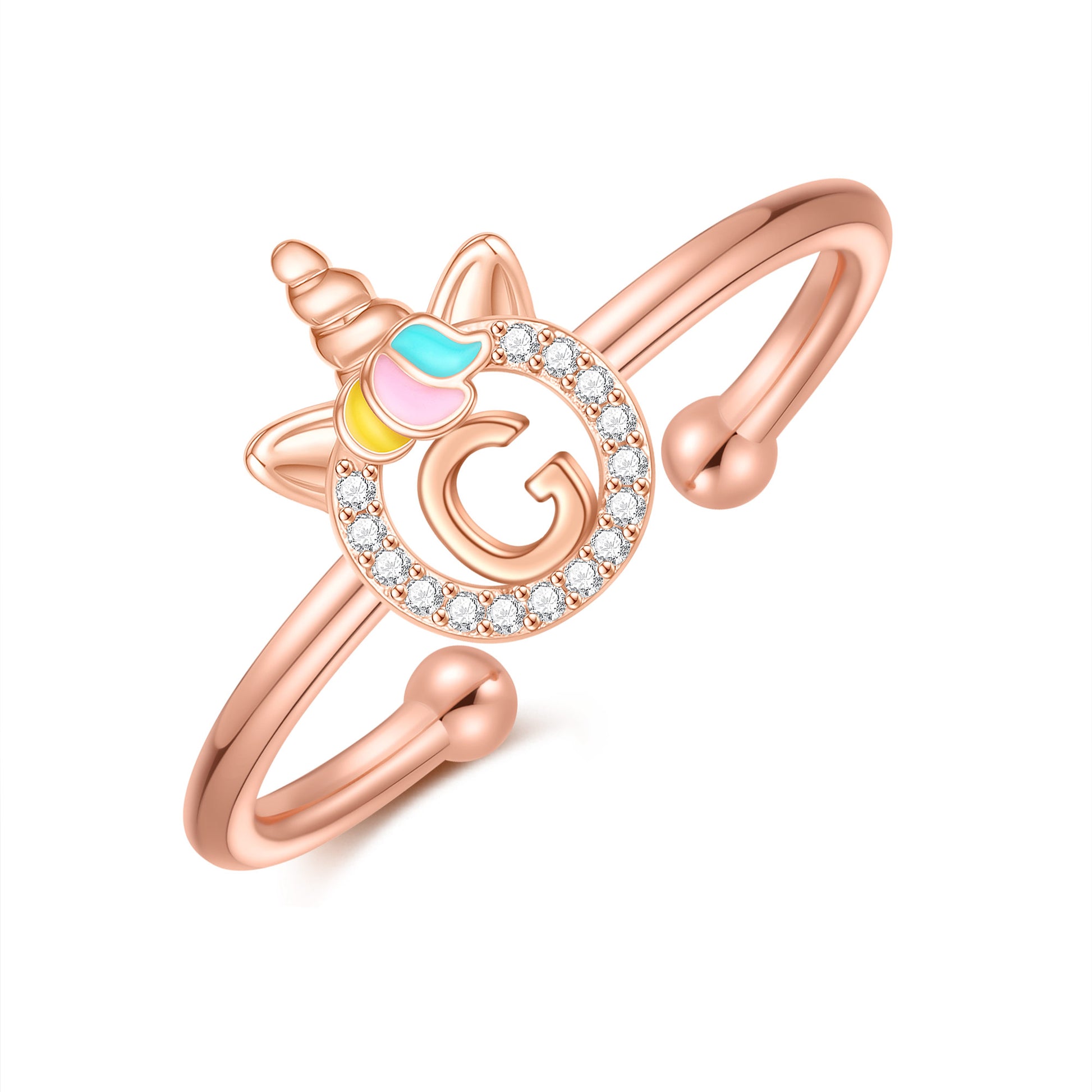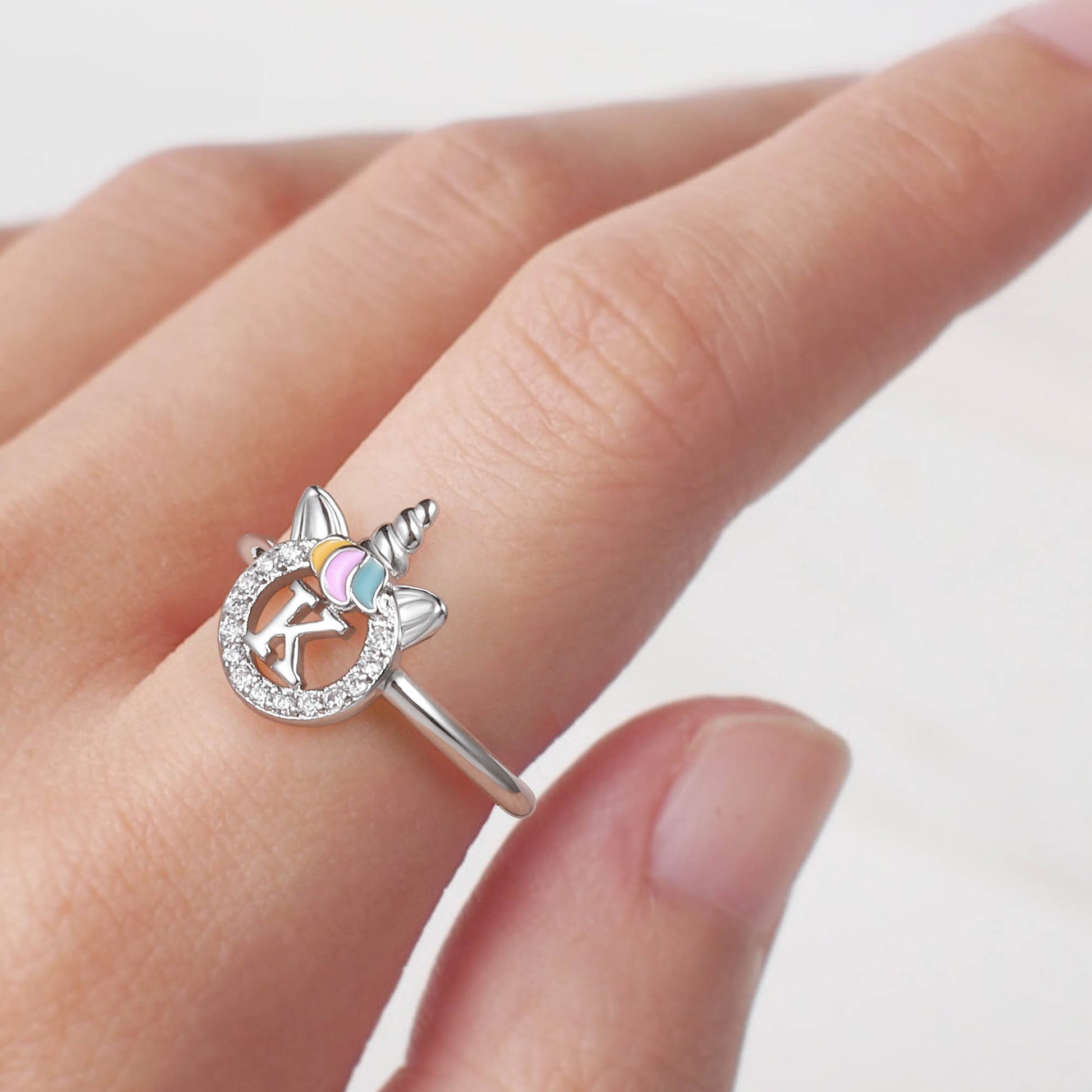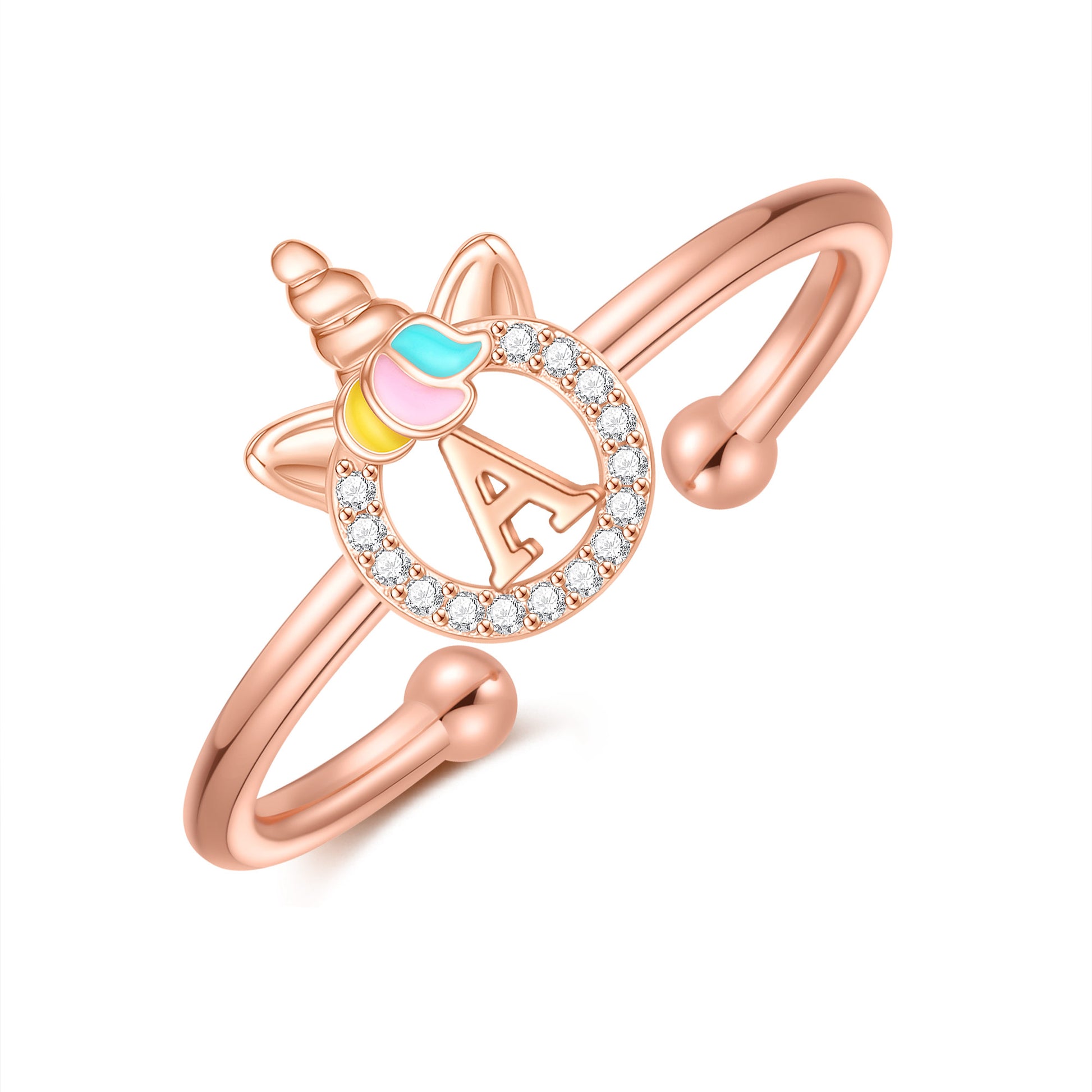 Unicorn Jewelry: Unicorns symbolize justice and bravery, as well as beauty, nobility, and purity. The unicorn girl's first letter ring prays for your happiness, good luck, health, and safety.