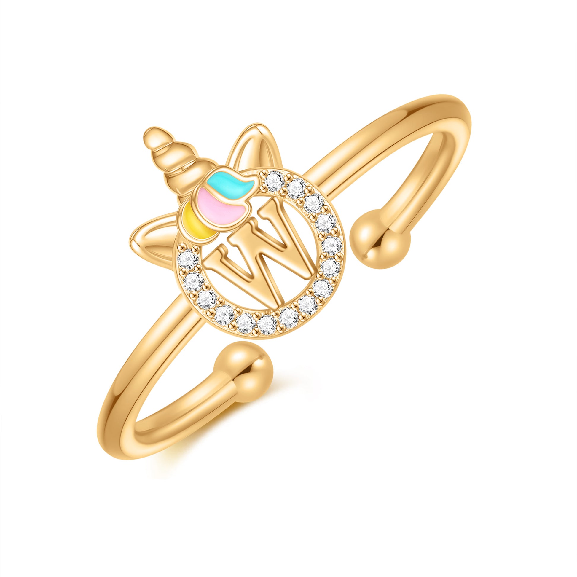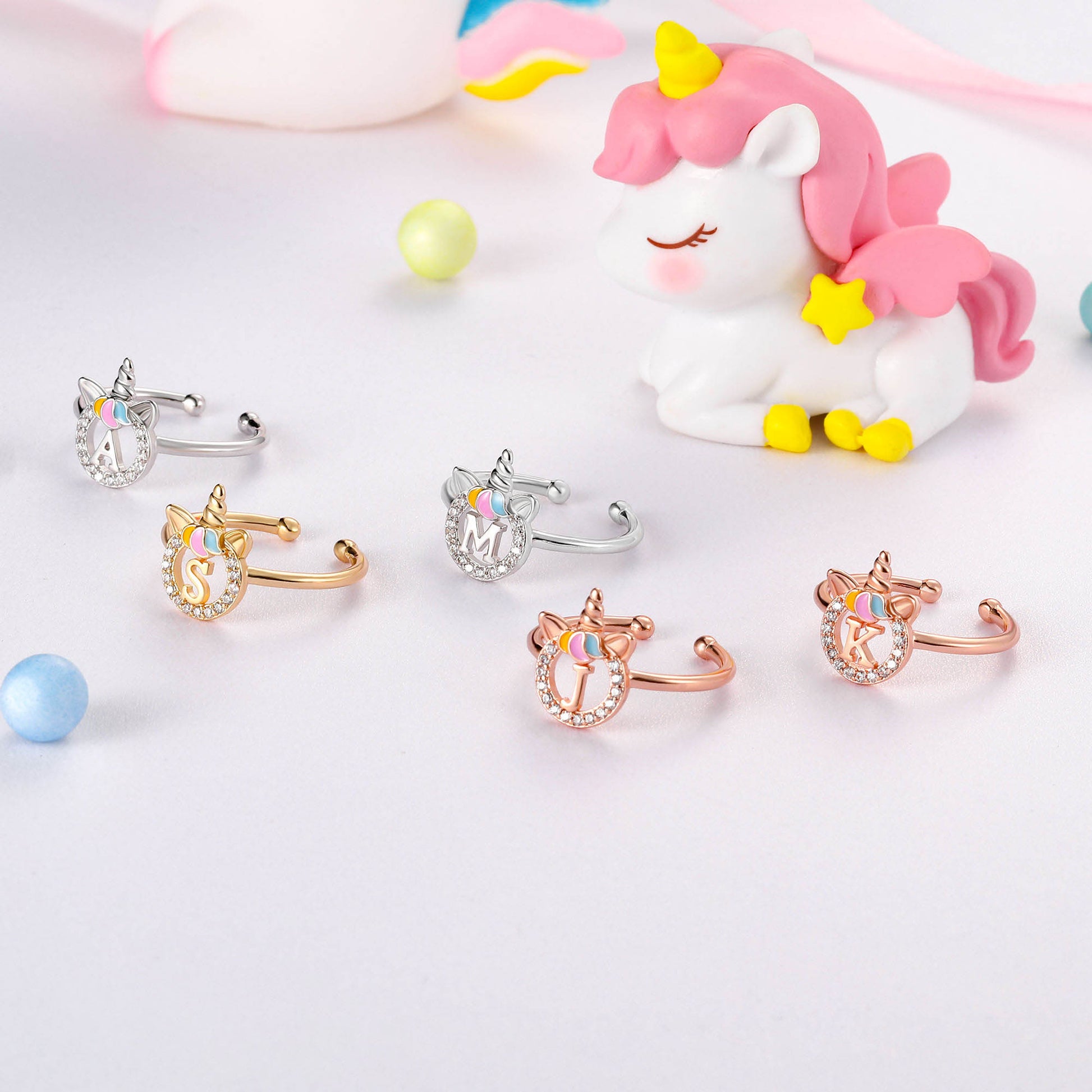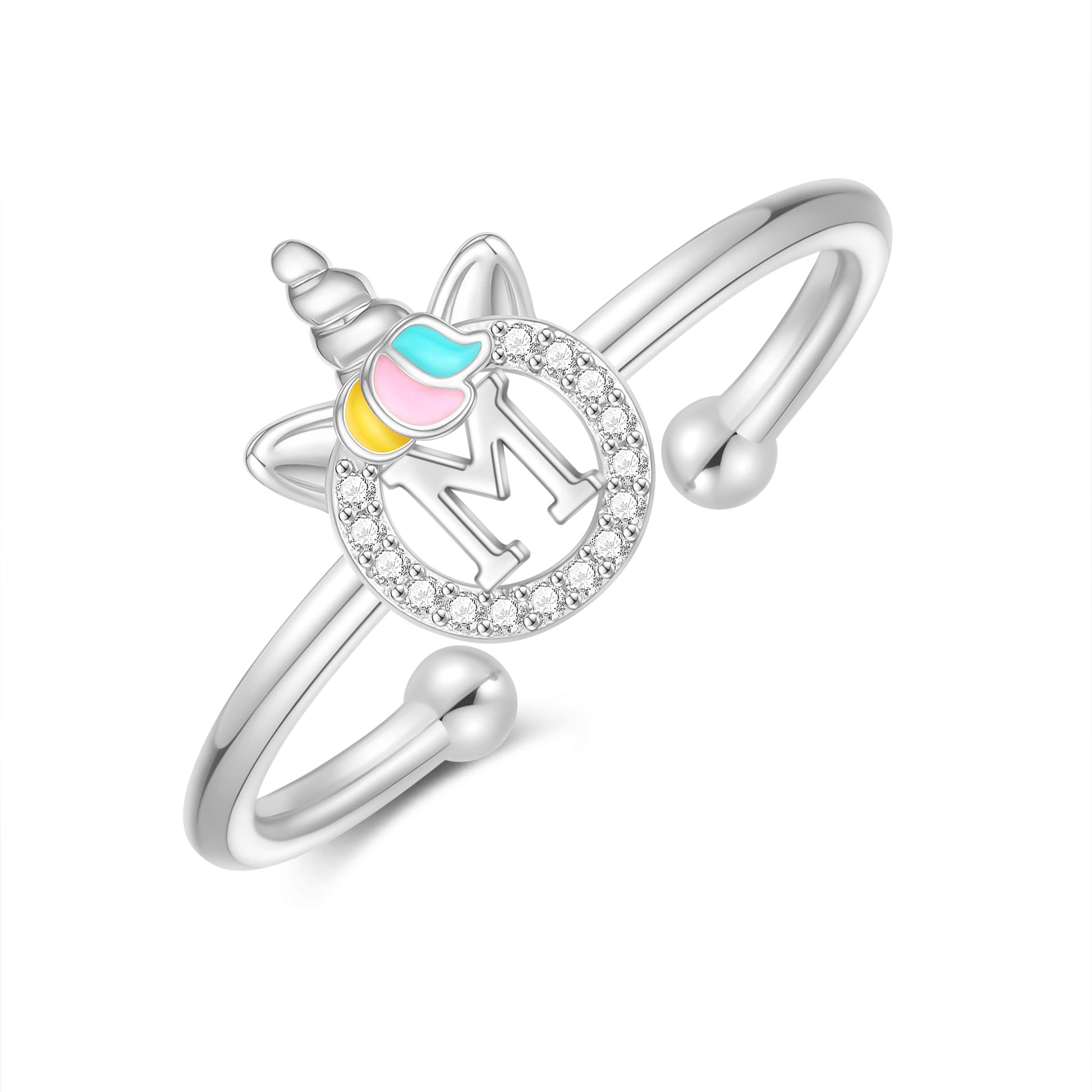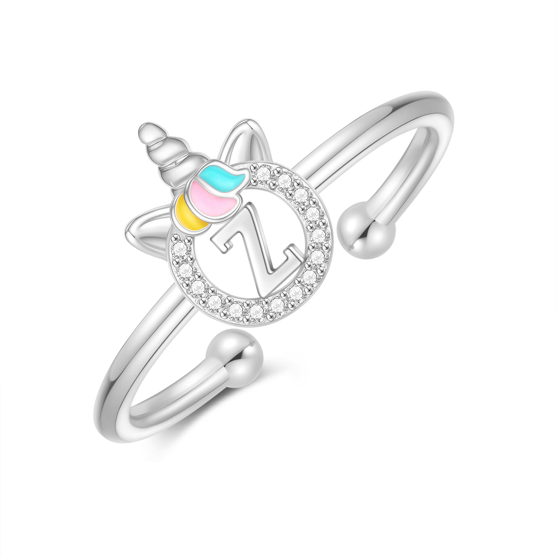 Unicorn Jewelry: Unicorns symbolize justice and bravery, as well as beauty, nobility, and purity. The unicorn girl's first letter ring prays for your happiness, good luck, health, and safety.