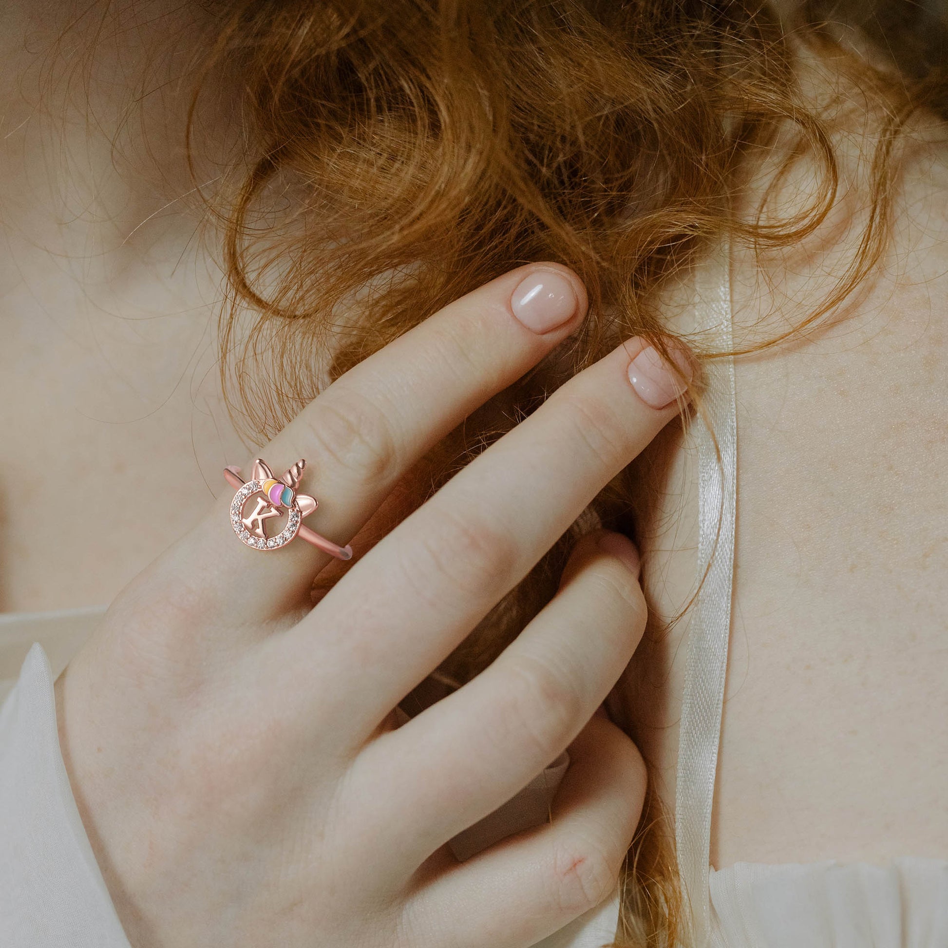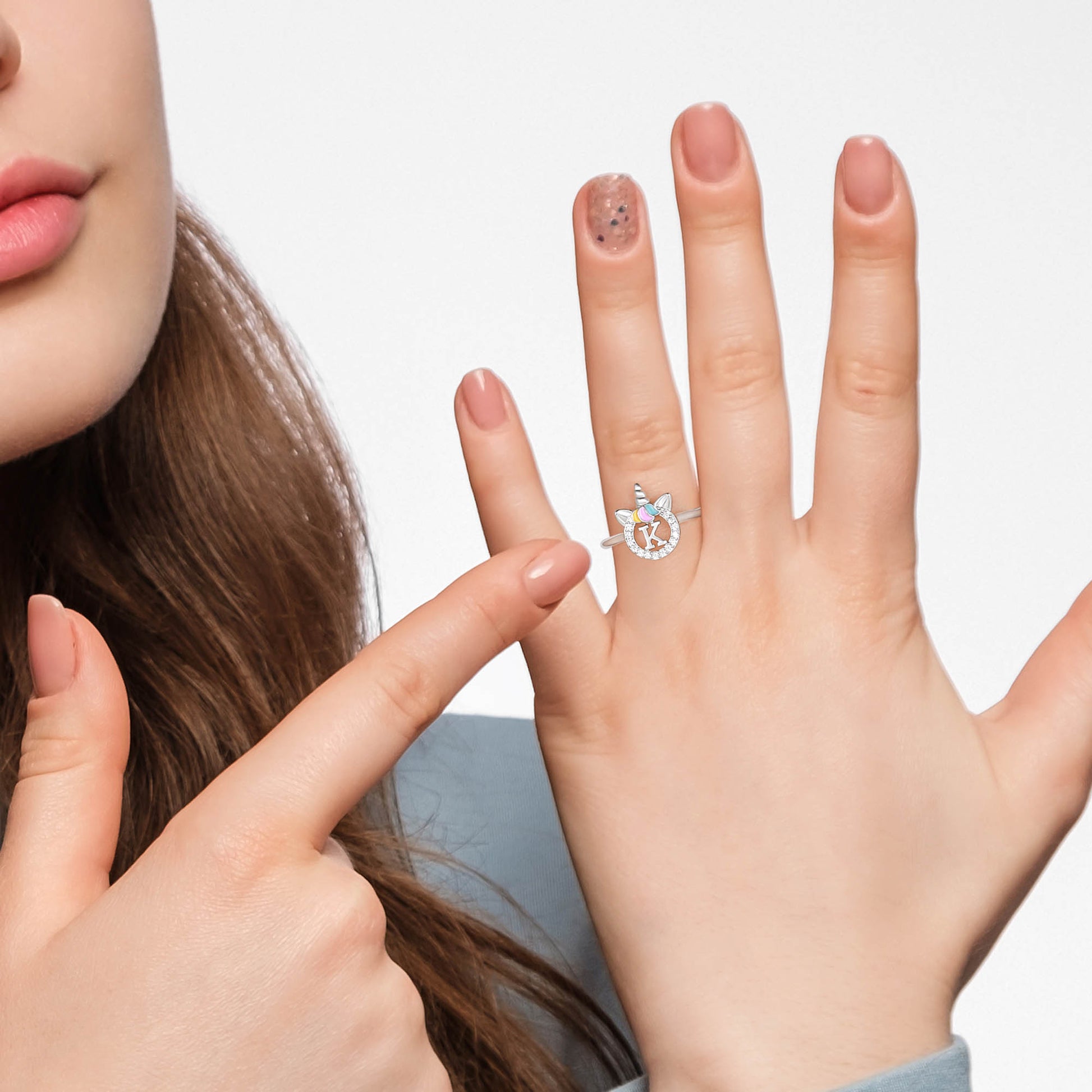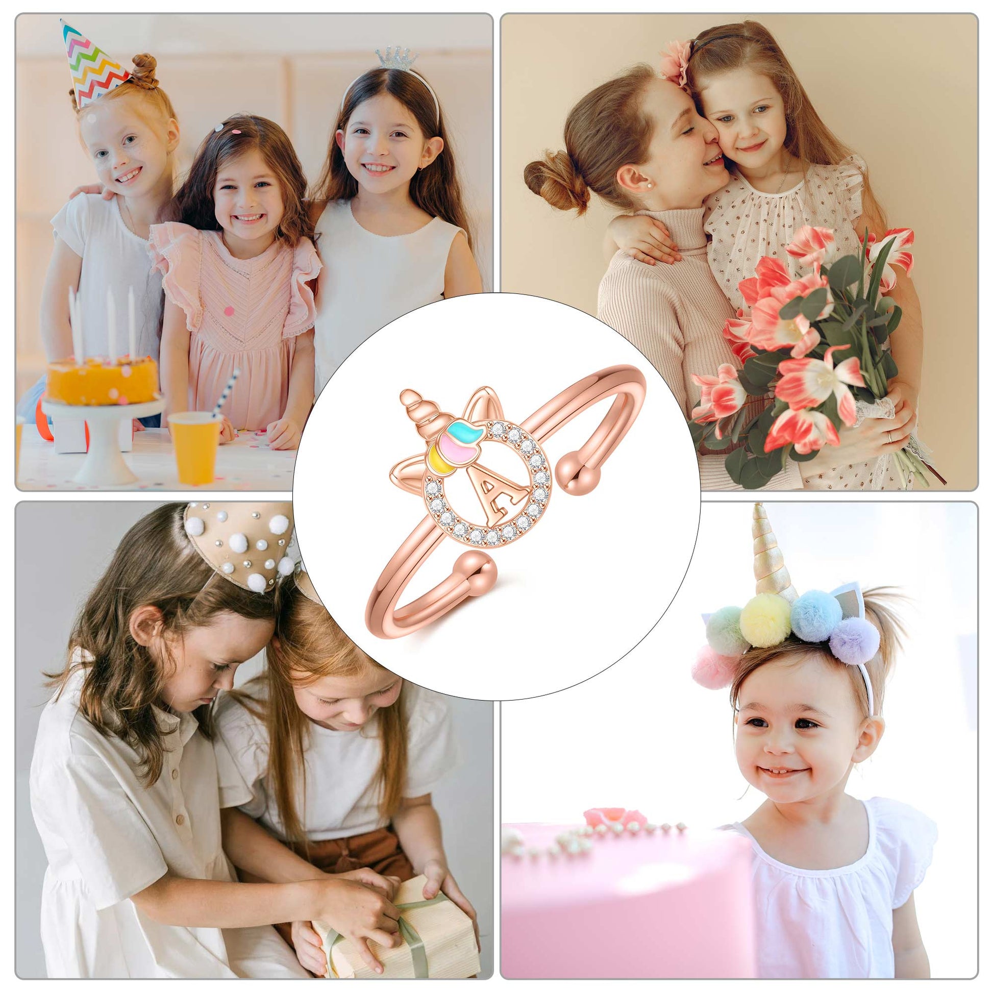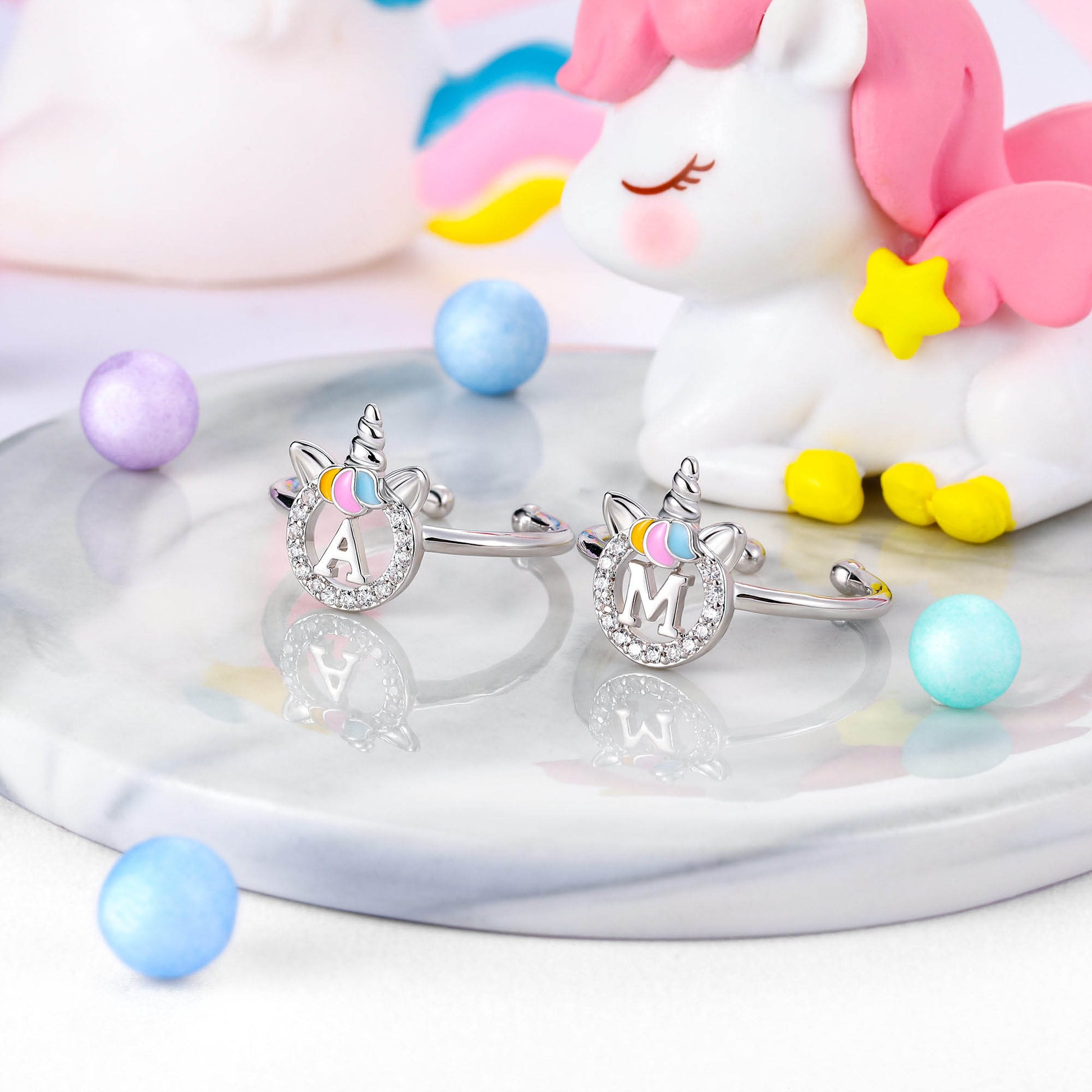 Unicorn Jewelry: Unicorns symbolize justice and bravery, as well as beauty, nobility, and purity. The unicorn girl's first letter ring prays for your happiness, good luck, health, and safety.