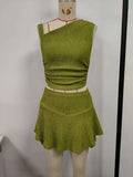 Green, suit skirt, top with one side exposed shoulder, short skirt hem