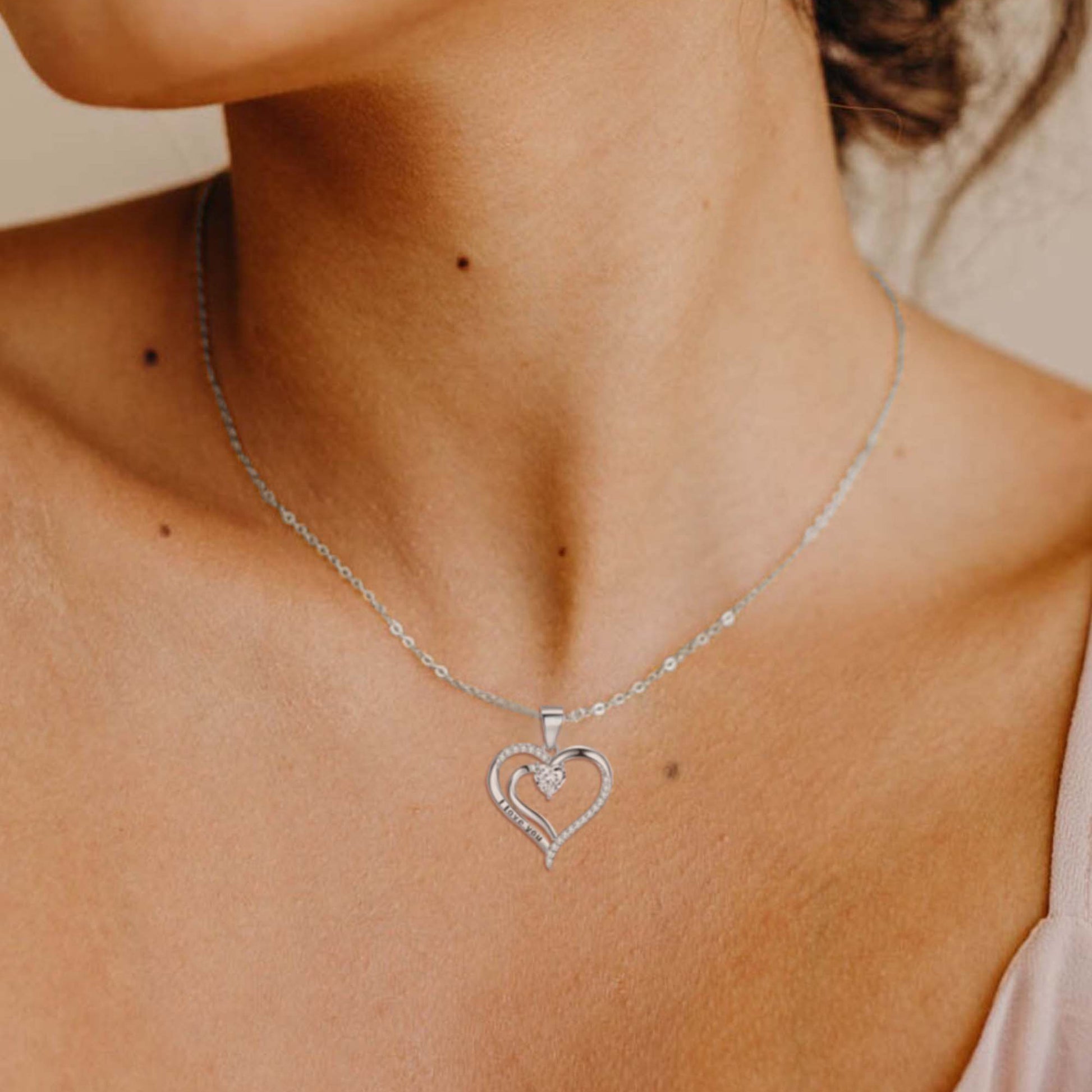 The double-sided heart-shaped necklace pendant is adorned with cubic gemstones of gemstone quality in the middle, with a unique design, precise cutting, and extraordinary brilliance.