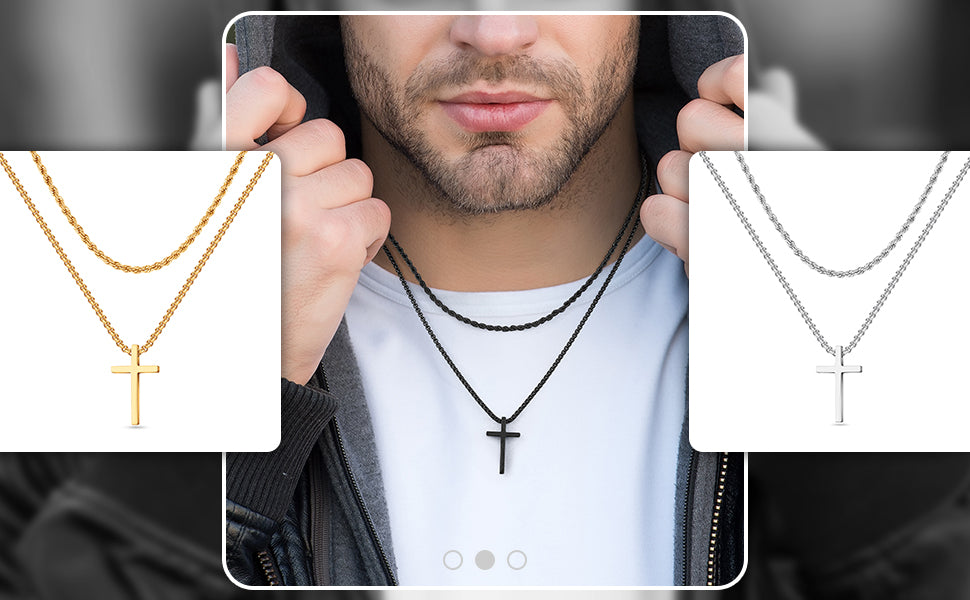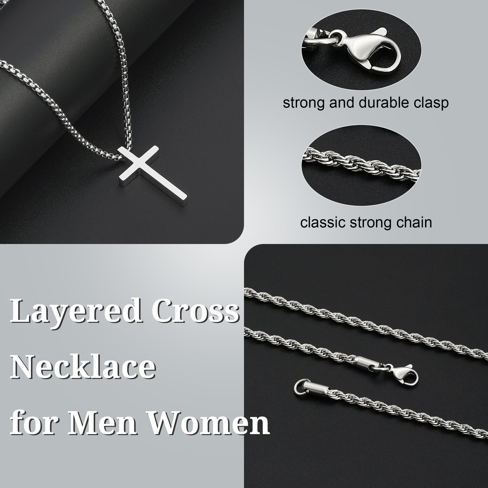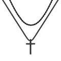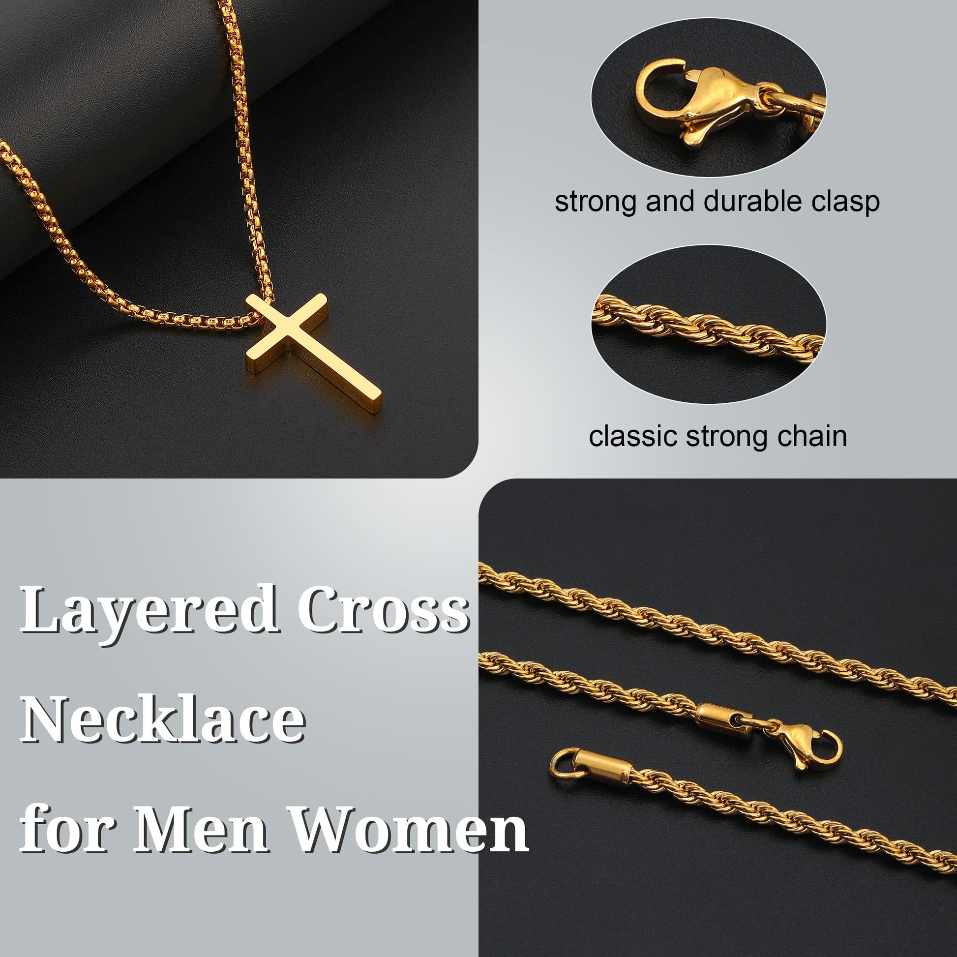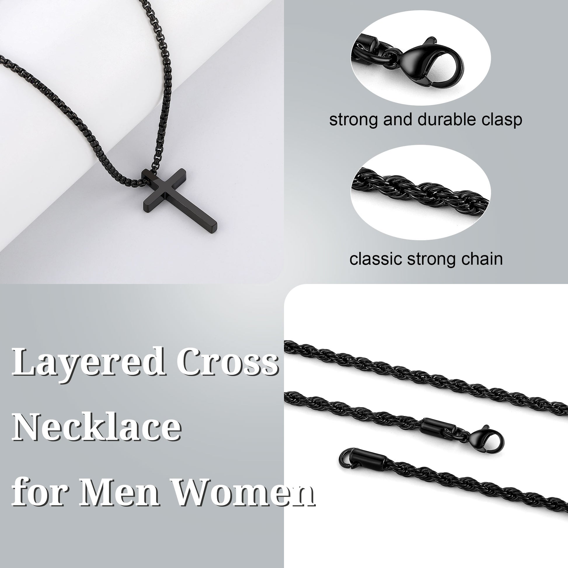 Black/Gloden/Silvery, stainless steel men's cross necklace, layered rope chain box chain cross pendant necklace, 16-24 inches