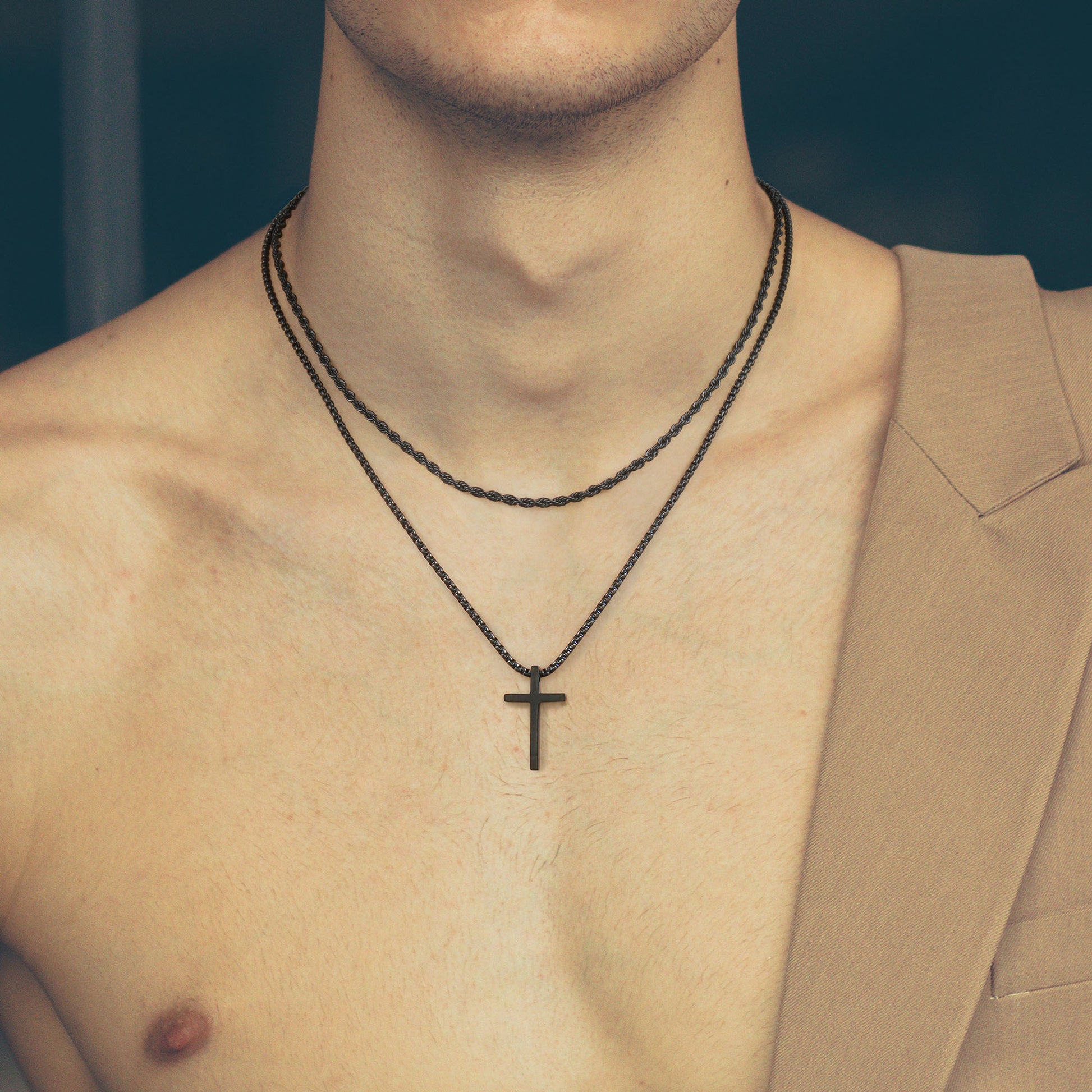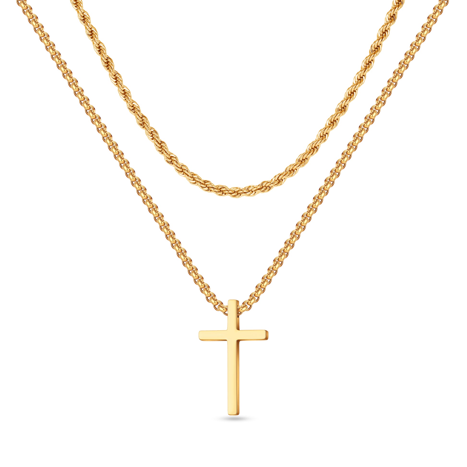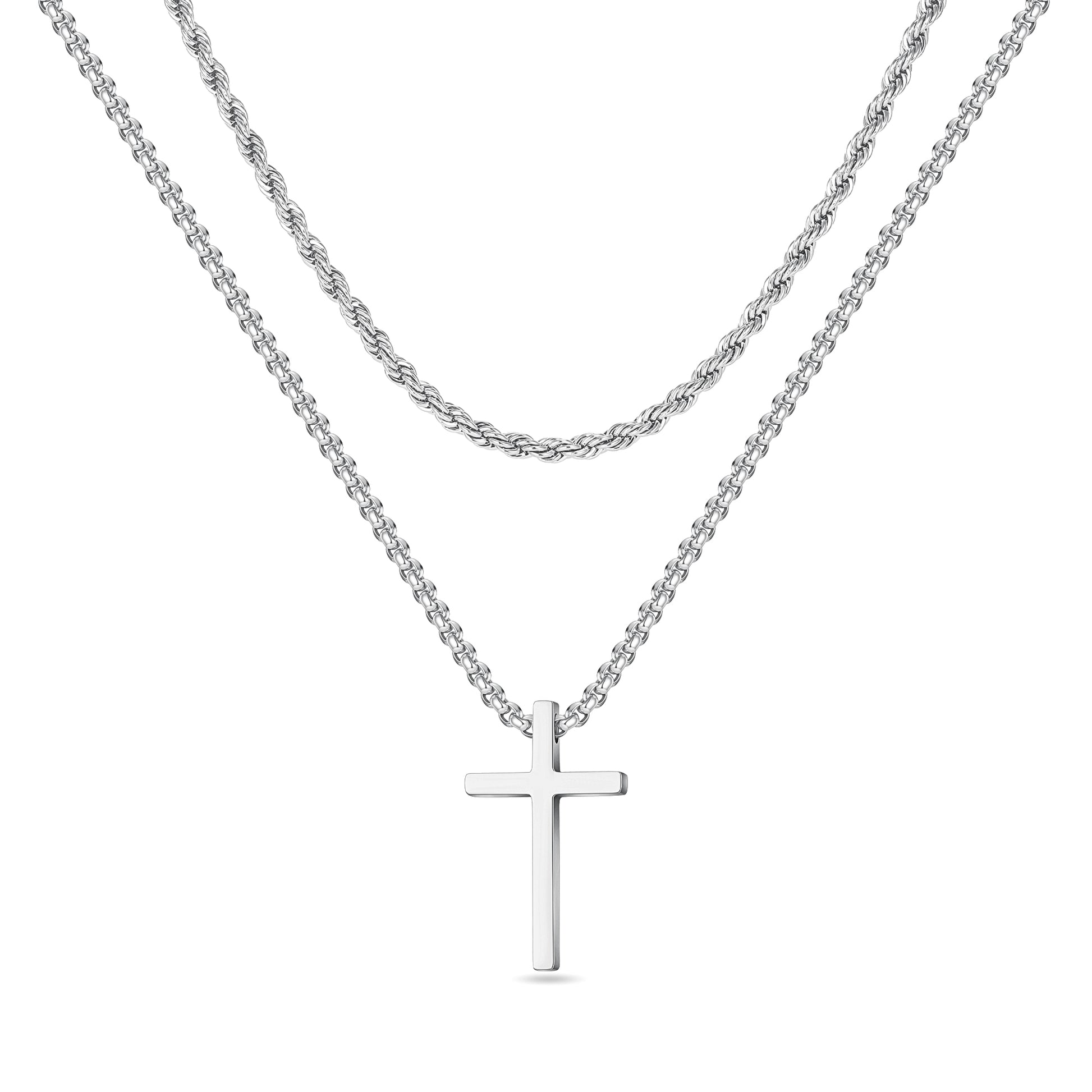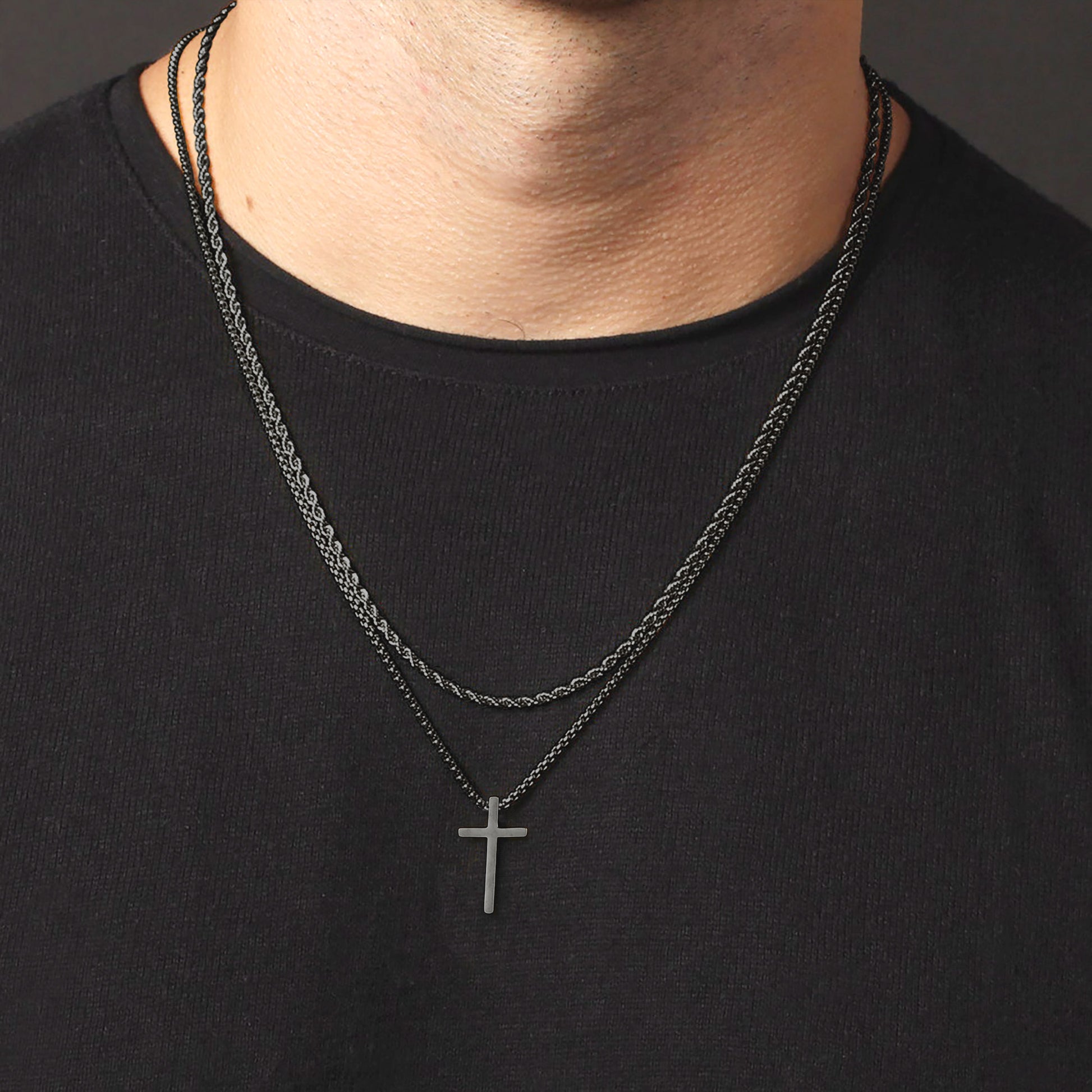 Black/Gloden/Silvery, stainless steel men's cross necklace, layered rope chain box chain cross pendant necklace, 16-24 inches